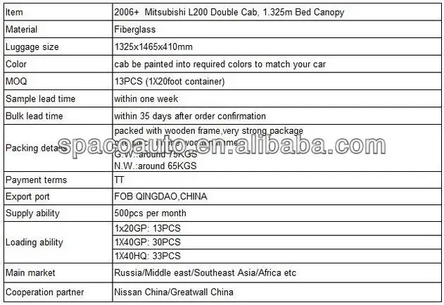 Pick up Canopy/Hardtop for 2006+ Mitsubishi L200 Double Cab,1.325m Bed.