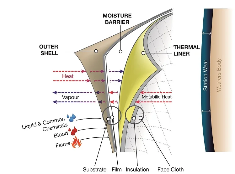 3. Thermal barrier quilted onto aramid-FR viscose face cloth. The thermal barrier gives extra flame and thermal protection.