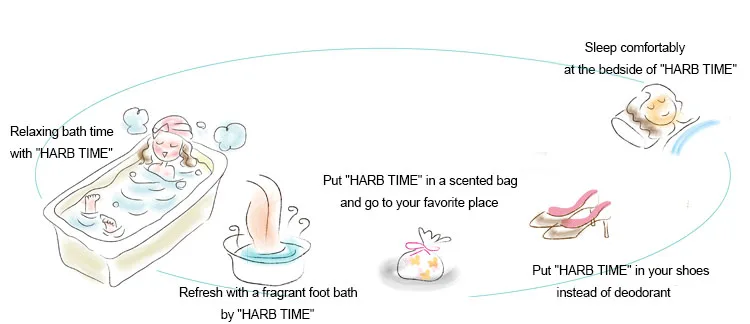 * Please put "HARB TIME" in the bathtub as a non-woven bag. It is effective to take it about 1 hour before bathing. Please take "HARB TIME" out of the bathtub when bathing. Once dried, you can use it again the next day. (The effect of fragrance, color, etc. is less than that of the first use). When you go to bed, just put it on your bedside to spread the natural aroma. (Please use unused products.) 〇 Please refrain from long-term storage of used products as they may cause mold.