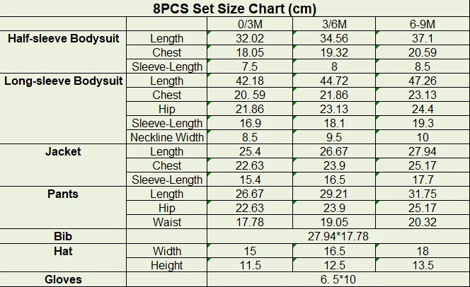 Set includes 1 long-Sleeve Rompers, 2 Half-Sleeve Bodysuits, 1 Shirt, 1 Pants, 1 hat, 1 bib, & 1glove