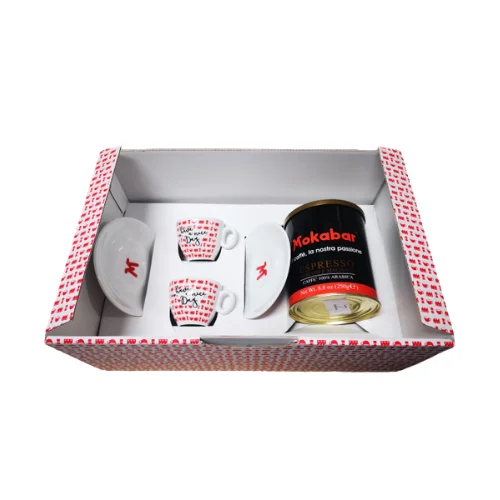 The gift box contains a couple of coffee cups and tin of ground precious blend of arabica coffee, ground in an optimal way bot for classical moka, both for the home espresso machines.