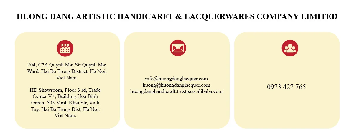 Huong Dang Artistic Handicrafts & Lacquerwares Co., Ltd is a private company issued Business Registration Certificate No. 0101761265 by the Department of Planning and Investment - Business Registration Section in Hanoi,Vietnam with abbreviated international transaction name as Huong Dang Lacquer Co.; Ltd, is glad to introduce you to the world of lacquerware, Gifts & Craft for your selection! Our manufacturing products are mainly engaged in handmade products such as Lacquer (boxes, dishes, trays, vases, candle holders, picture frames, mirror frames, photo albums, coasters, panels, paintings, etc.).
