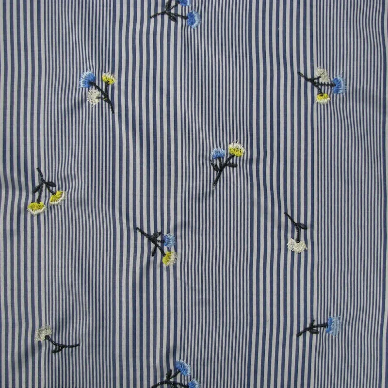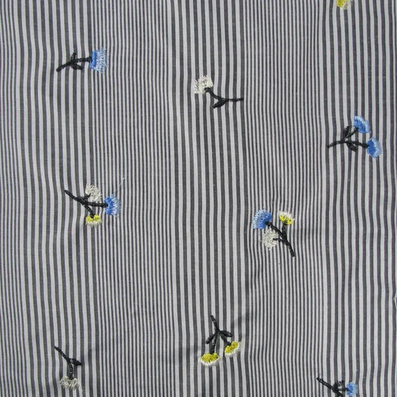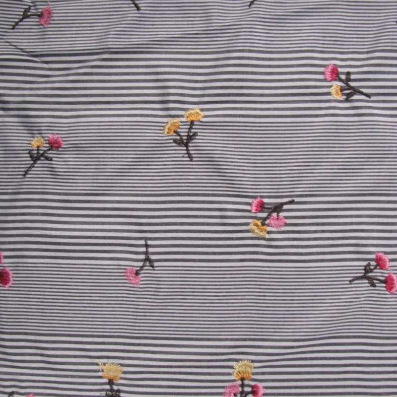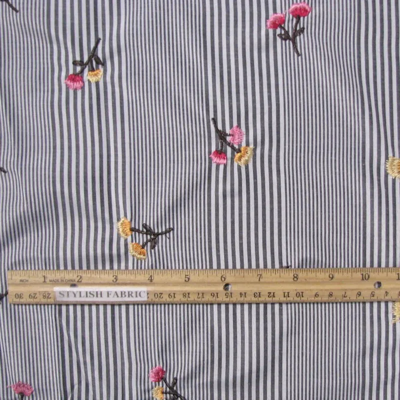 Fabric Name | Black Apricot Flowers Embroidery Drawstring Design on Stripes Cotton Voil Fabric |