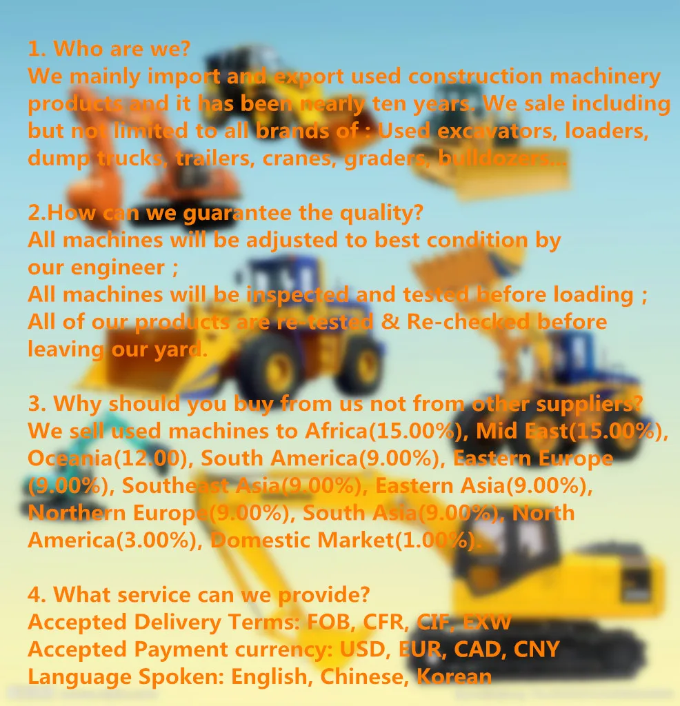 We mainly import and export used construction machinery products and it has been nearly ten years. We sale including but not limited to several brands of : Used excavators, loaders, dump trucks, trailers, cranes, graders, bulldozers...