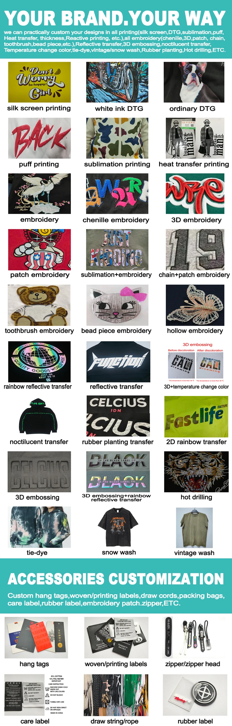 Logo and Design | Custom LOGO design | Silk screen printing--Water ink , Rubber ink , Foil printing ,Velvet printing, Glitter printing , Emboss printing,etc. Embroidery--Normal embroidery,3Dembroidery,Beadembroidery,etc . Rhinestone,Nailhead,Rhinestud,etc . Washed technic,Dip-dye,Patch ,Woven,etc. |