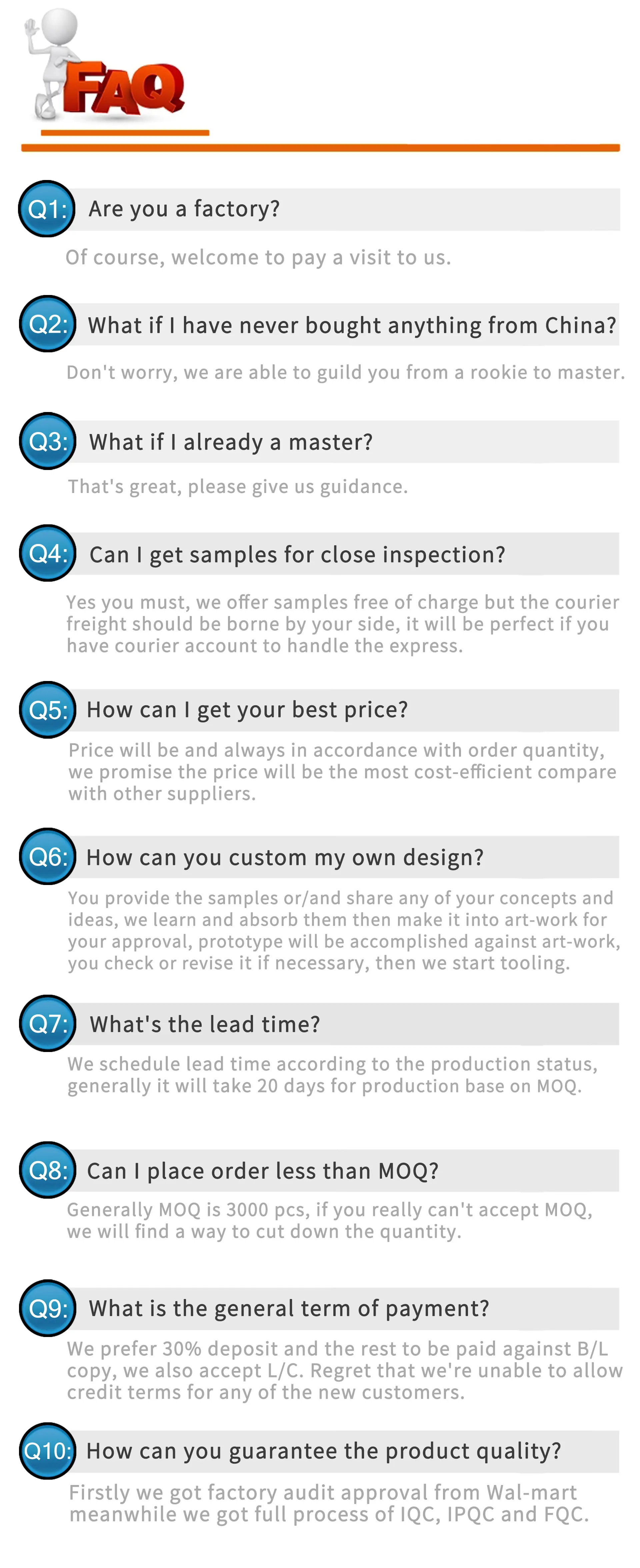 Sample | We can express out in 2 days if there is current sample and got freight collect account. Customized sample is around 5-7 days | ||||||