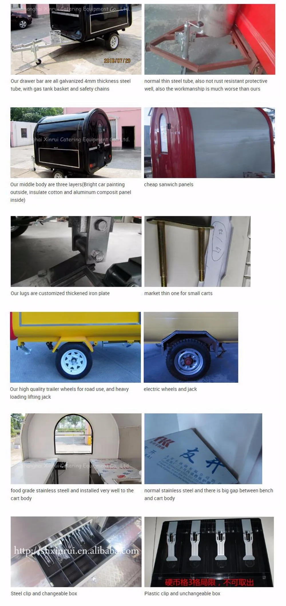 Whole Fiberglass Reinforced Panel (FRP)45mm construction with strengthening rib at major parts Three big selling windows in one side and front One door in the back 304 stainless steel working benches & related shelves One business cash drawer High visibility tail light signal system | |