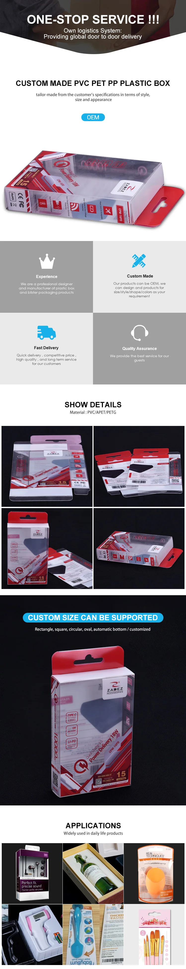 --The material,(PS,PET,PETG,PP are eco-friendly material, PVC is not eco-friendly, but the price for PVC material is cheaper)
