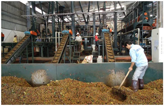 Next, the coffee will be washed in water after the impurities such as leaves, branches... are removed.