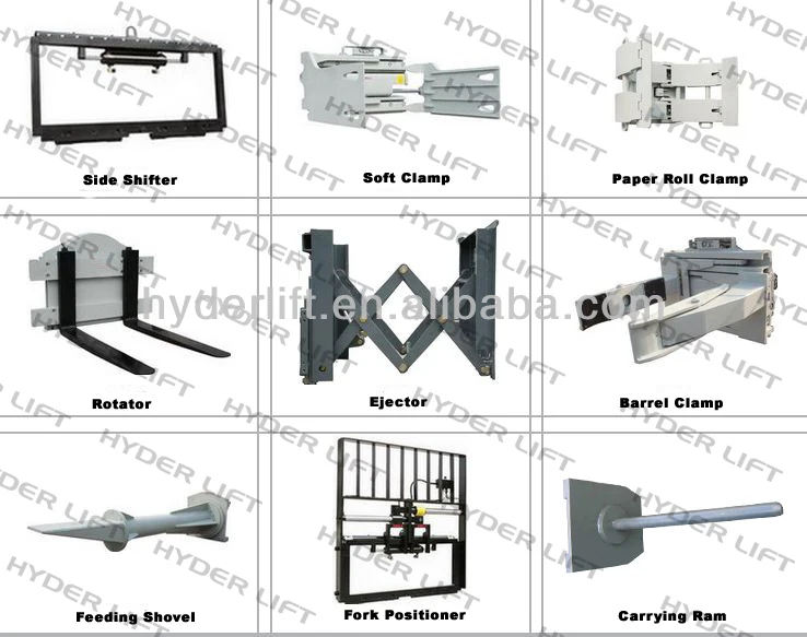 Attachment: Side shifter,rotator,ejector,fork positioner,paper roll clamp,soft clamp,barrel clamp and so on