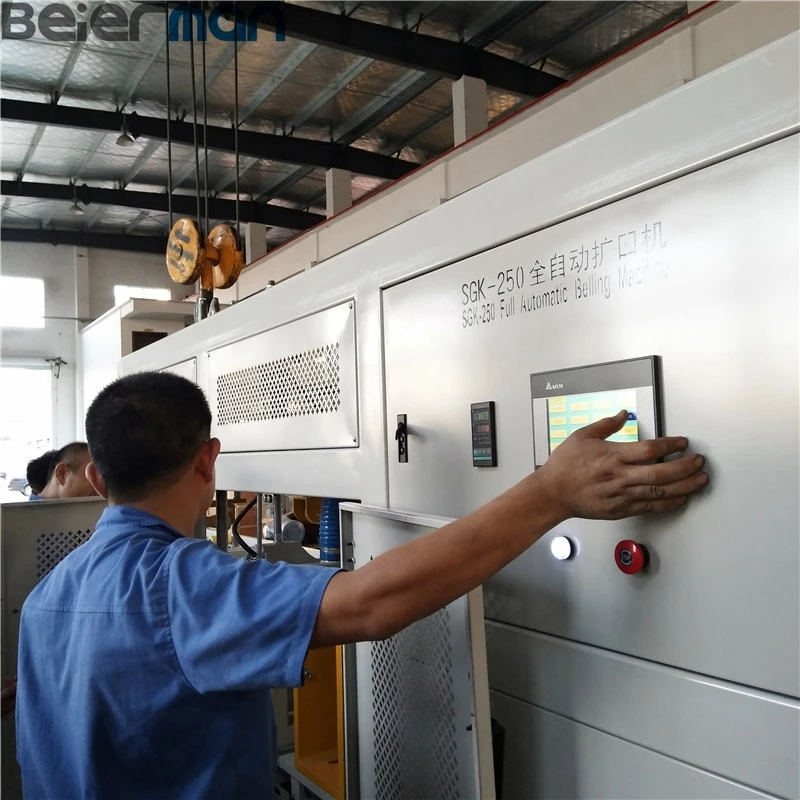 China Origin 50-250mm PVC automtic pipe socketing machine was specially designed for the PVC sewage pipes, water supply pipes, electric cables pipes, PVC conduits automatic belling with "u" and "R" styles.