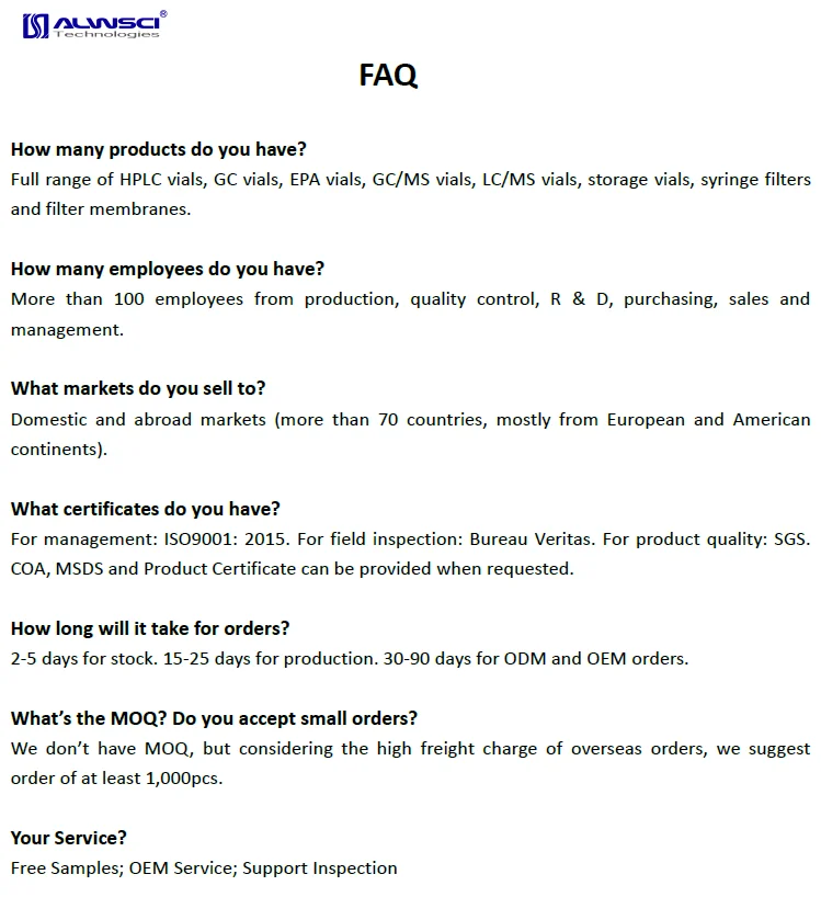 > 12years Experience in Chromatography Consumable Field; >Alwsci Own 10,000 SQM factory with 5,000 SQM 100,000 grade cleaning room; > 10+ automatic production line >Main Products: Hplc and GC Vial, cap, septa; also syringe filter and membrane filter;