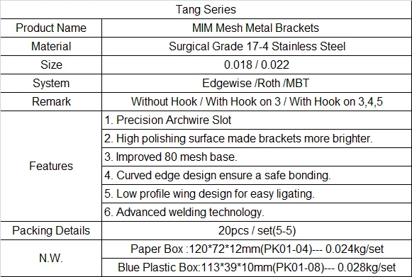 2.MIM mesh brackets:Two piece construction, Metal Injection Molding tech made brackets body, welding with mesh base, Lower profile, deeper wings for ligating, round ball hooks, hole code mark, 17-4 stainless steel made, better hardness.