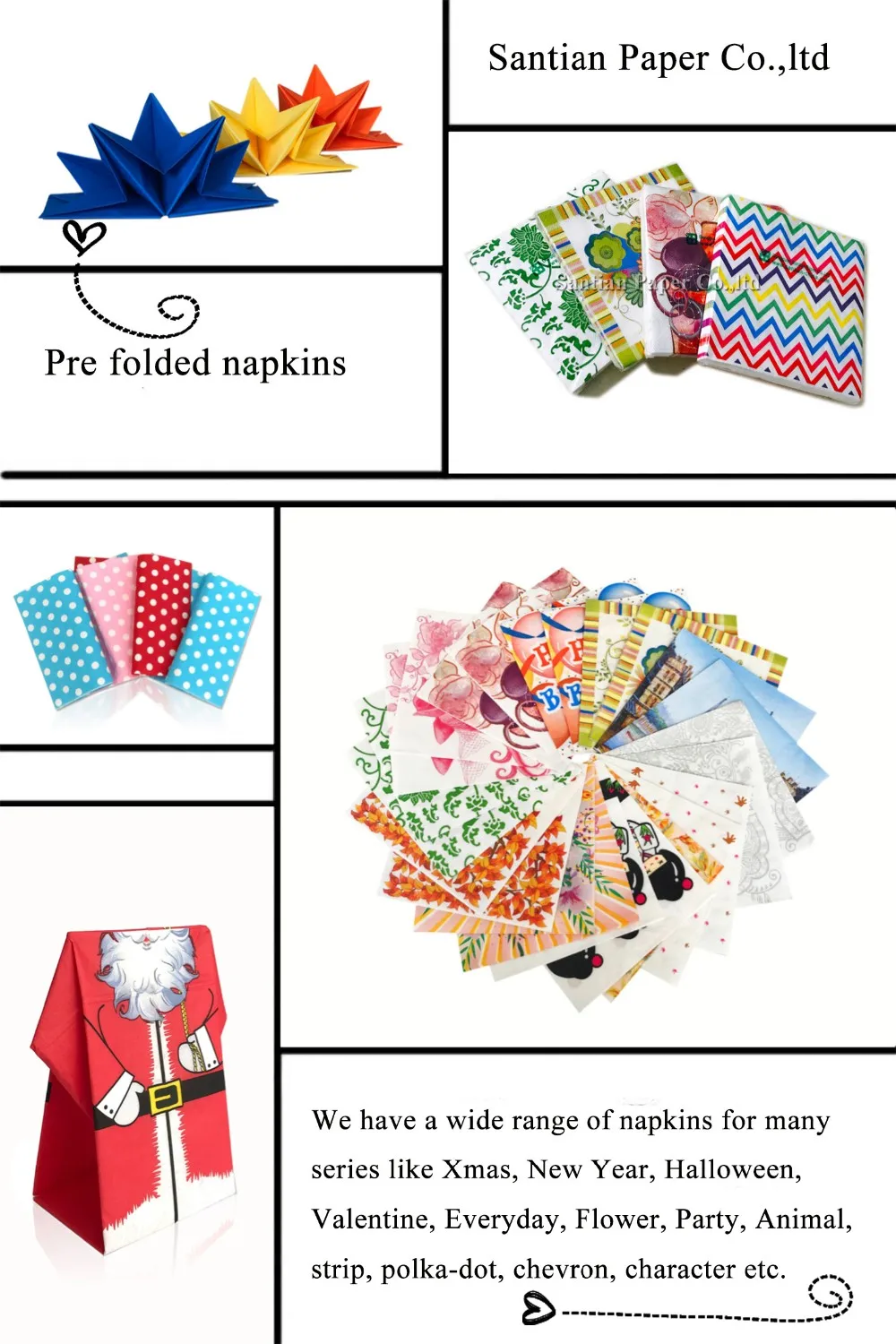 Santian Paper Co., Ltd. , a professional manufacturer of printed paper napkin engaging in product research,development, production, and sales service.