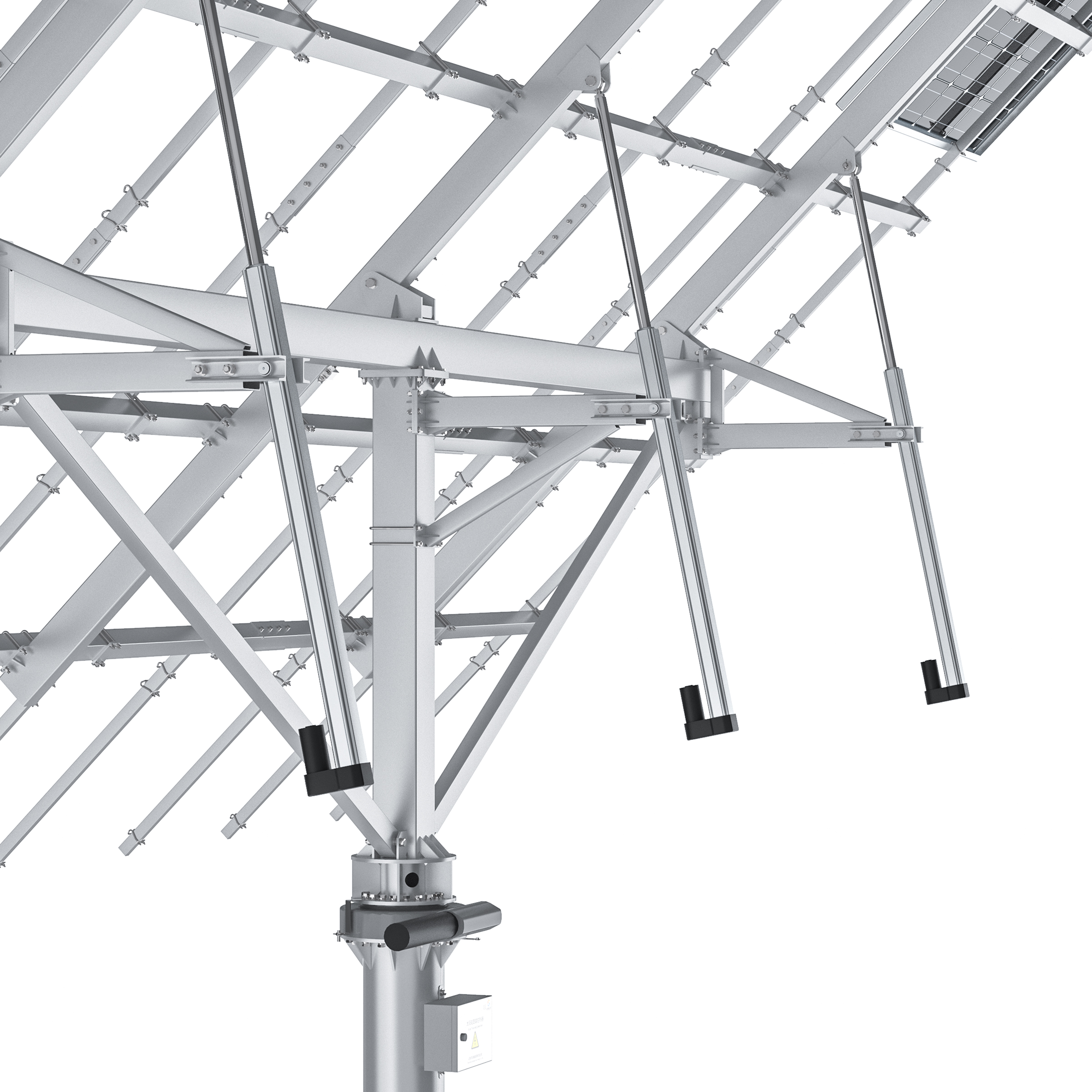 Single axis solar tracker has a set of drives and controllers to realize automatic tracking for the entire array. The unique linkage structure and maintenance-free rotary bearing supports reliability, low failure rate and low maintenance cost.