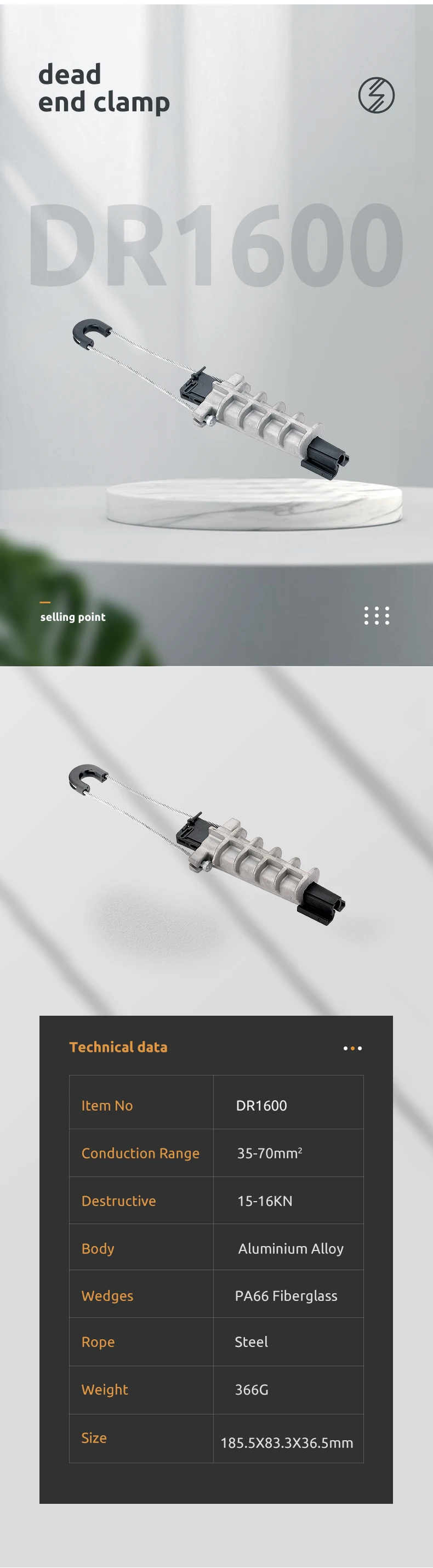 Material:High strength aluminum allloy,nylon plus fiber glass,stainless steel Product property:They are characterized by high mechanical stability,reduced dimensions for easier handling,high mechanical and climatic.Cable gripping device in insulating material ensures the double insulation of the neutral core and avoids damage to sheath,secured parts,no tools required.Stainless steel bail with two marbles compressed on the end,this conception allows an easier locking on the body of the clamp.They are in accordance with NFC 33-041 EN50483