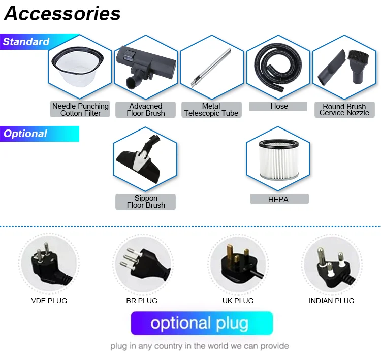 | Standard | Hose Assembly / Metal Teescopic Tube / Round Brush / Floor Brush / Crevice Nozzle / Needle-punching Cotton Cloth Filter | ||