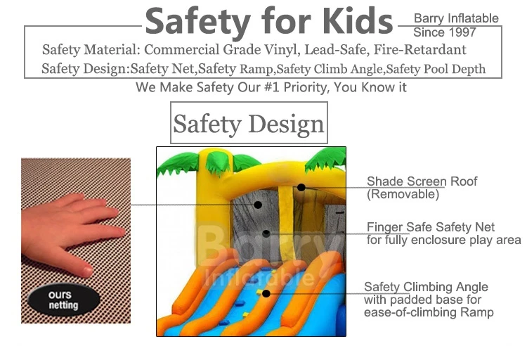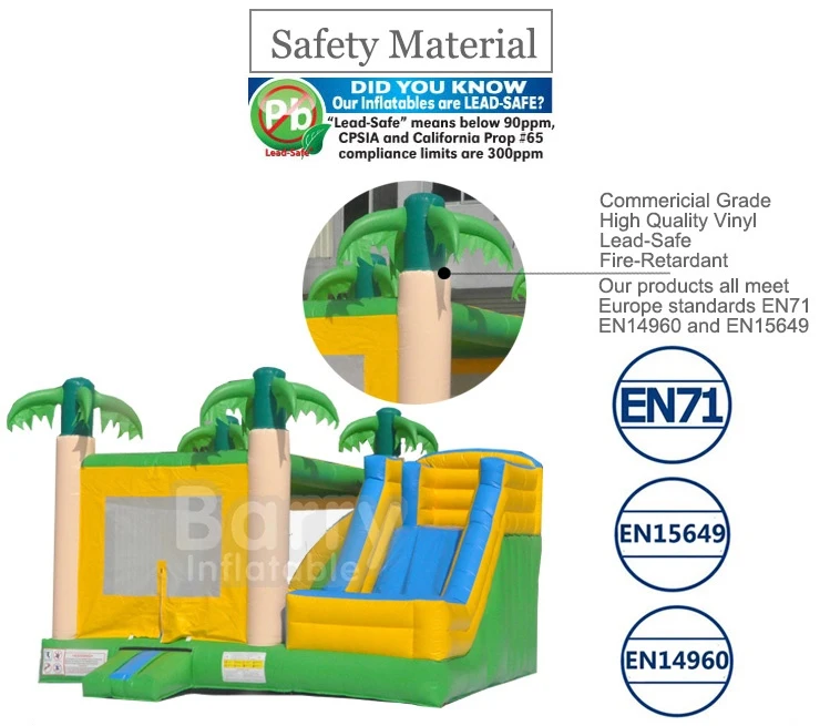 All of our inflatables are constructed from materials that are lead-safe, meaning levels below 90ppm and meaning our inflatables are safe for children. We also use vinyl materials that are flame-retardant and meet different countries, large and small-scale tests. Do your homework before dealing with any inflatable manufacturer, and make sure they're not using cheaper materials that could be dangerous to children. We never cut corners with our products, and always strive to provide the safest environment possible, even if it costs a little more.