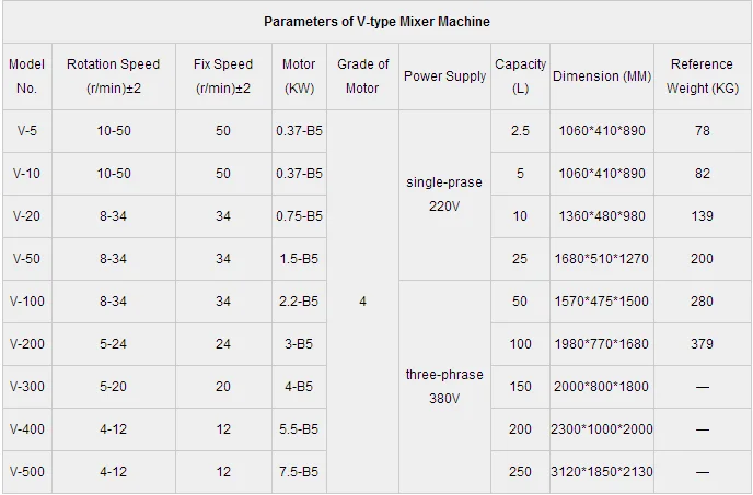 V-type mixer machine is composed of container welded with two cylinders. Shape of cylinder is asymmetric. Because of rotary motion, granule powder is segmented and merged continuously and repeatedly, feed material is delivered from one to another, and powder particle is stacked multiplexer with slip of powder and is constantly distributed on surface of powder.