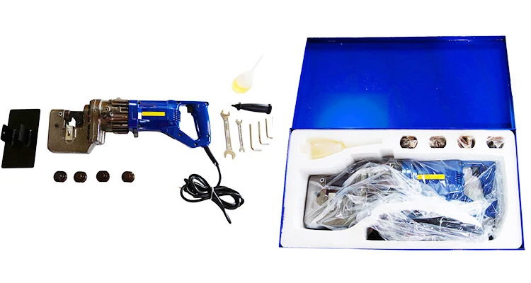 电压 (Voltage) 220V/110V 功率 (Wattage) 900W/1150W 毛重 (Gross weight) 20 kg 净重 (Net weight) 12 kg 冲孔速度(Cutting speed) 2.0-3.0 s 最大直径 (Max rebar ) 20 mm 最小直径 (Min.rebar ) 4 mm 最大板厚 (Punching thickness) 6 mm 包装尺寸(Packing size) 545x310 x180 mm 机器尺寸(Machine size:) 500 x195 x100 mm 包装:内铁盒包装, 外 7 层 瓦楞纸箱包装 Package:one pc /Metal box/ Cardboard Ctn 证书 Certificate: CE ROHS PSE KC 适用于钢,铁,铜,铝板,钢结构,槽钢,工字钢等打孔作业,体积小,重量轻,易于操作,省力且快速冲孔。 use for punching on steel plate, angle steel plate, iron plate, copper plate, aluminum plate, U-steel, I-steel etc. portable,small,easy to operate,saving power and quick to punch .