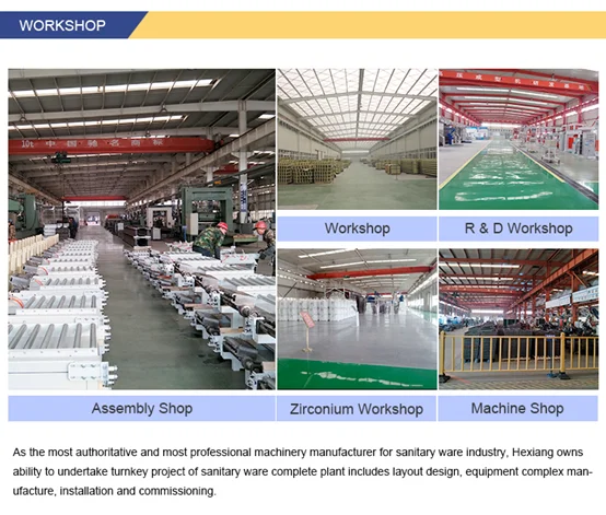 Hexiang owns a 11000m2 R&D building and a joint workshop with floor area over 53,200 m2, can undertake large and medium-capacity sanitary ware turnkey project plants including technical process designing, equipment installation & commissioning and after-sales service providing, is widely recognized as the "Well-known Technical Proposal Supplier, Equipment Manufacturer, Service Provider" by domestic and overseas customers.