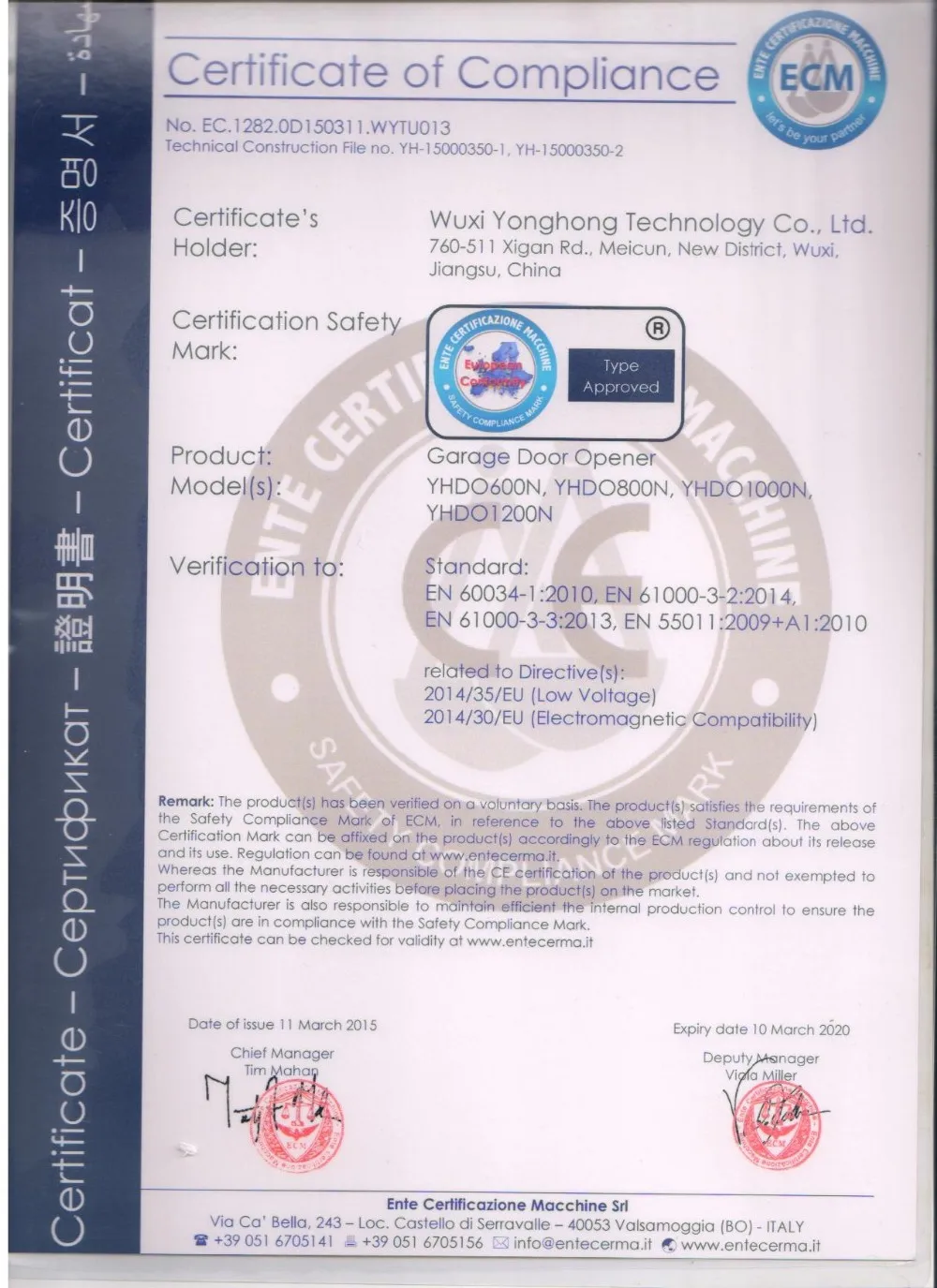 A: Yes, we do have CE certification. We have CE for our complete automatic garage doors.