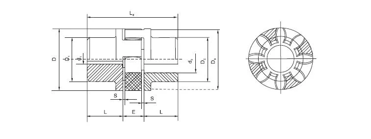 Type | Nominal torque (N*m) | Max speed (rpm) | Bore diameter d1,d2 (mm) | Bore length L (mm) | L0 (mm) | D (mm) | D1,D2 (mm) | D3 (mm) | d1,d2 (mm) | E (mm) | S (mm) | Moment of inertia (kg*m2) |