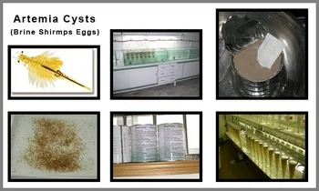 Artemia cysts (brine shrimp) is packed in either 425g vacuum sealed cans, 12-cans per case. Also available in vacuum sealed 7.5kg pails. Artemia cysts (brine shrimp) are stored in bulk, airtight drums under cold storage conditions (4 degrees C). Allotments and orders are tested for quality before packaging. Our quality control standards insure that the products are guaranteed fresh and meet our hatching percentage specifications.