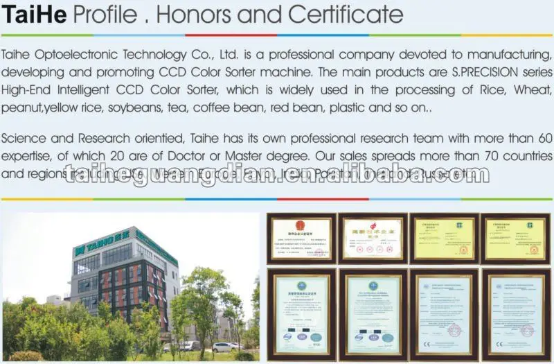 As a professional wheat grain color sorter manufacturer in China, Taihe Optoelectronic Technology Company also produce other products, such as rice color sorters, tea colour sorters, beans colour sorters, and coffee bean color sorters. These color sorting machines have the features of reliable quality, great reliability and long service life. Hence, they are commonly used in the areas of farm product processing and industrial product production.