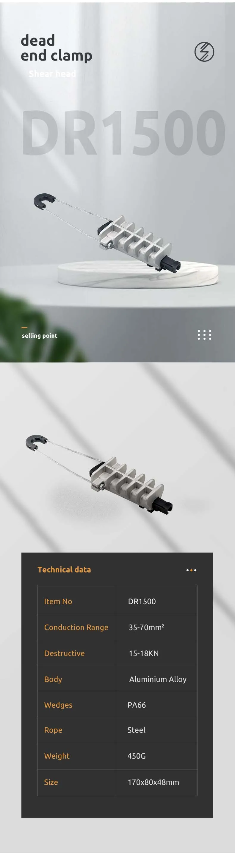 Material:High strength aluminum allloy,nylon plus fiber glass,stainless steel Product property:They are characterized by high mechanical stability,reduced dimensions for easier handling,high mechanical and climatic.Cable gripping device in insulating material ensures the double insulation of the neutral core and avoids damage to sheath,secured parts,no tools required.Stainless steel bail with two marbles compressed on the end,this conception allows an easier locking on the body of the clamp.They are in accordance with NFC 33-041 EN50483