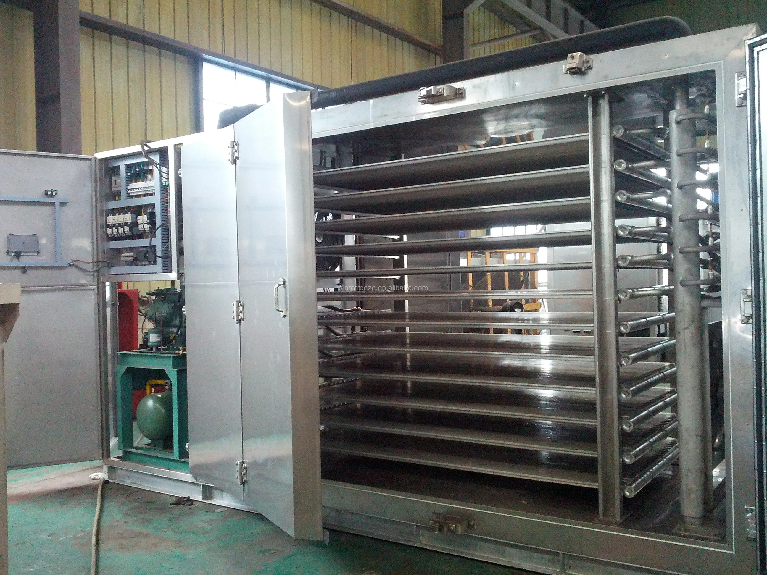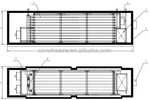 Model | Freezing capacity (kg/batch) | Plate no. | Plate size (mm) | Tier pitch (mm) | Refrigeration capacity (kw) | Overall dimension L*W*H(mm) |