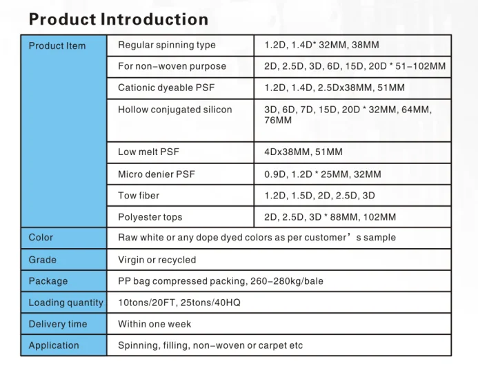 We supply 6D,7D or 15D hollow congugated siliconized (HCS)polyester fiber or hollow conjugated(HC)fiber, recycled and virgin for filling materials. 1000tons per month, delivery within 2 weeks.
