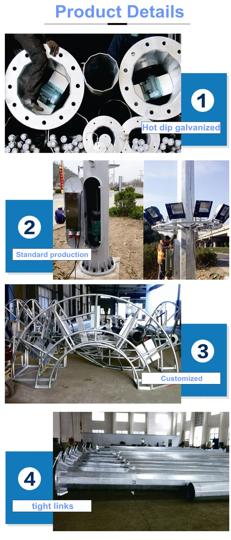 1) Designed or improved for various kinds of Road light,street light pole,outdoor lighting pole, street lighting pole, road lamp pole,steel pole,l high mast poles, and traffic single pole.