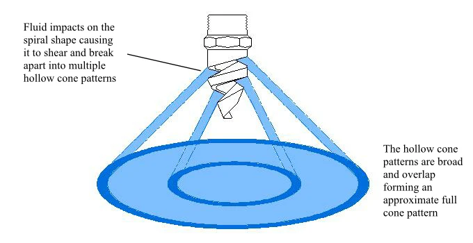 2 | How is this spray pattern achieved through nozzle design? A spiral helix directs the liquid after it leaves the orifice. Each spiral turn allows for a different spray angle, thus creating a full cone nozzle. |