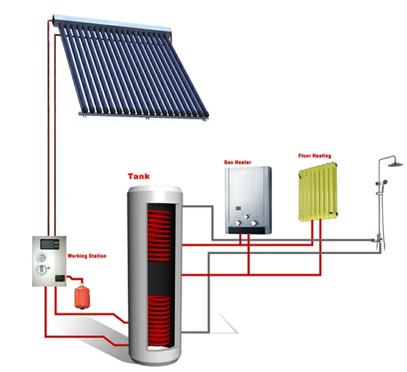 3)The heat-conducting liquid transfers heat to water by heat ehchanger in the water tank.