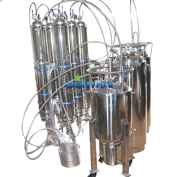 2. Double-layer bottom filter board structure The filter board at the bottom of the extracting tank adopts the double-layer design. One layer is made of stainless steel sheet with a thickness of 5-6mm and round holes with a diameter of 10mm at its top. This layer plays a supporting function. On the supporting layer is a layer of thin stainless steel sheet with a thickness of 0.6mm, with long holes of 0.5 X 10mm distributed at its top. Comparatively speaking, the long holes are more difficult to be blocked. The steel sheet of this layer is machined by laser punching, which has smooth surface and is easy for cleaning. The double-layer filter board has a hinge structure at the 1/4 place, which can be conveniently opened to check the cavity and its cleanliness under the filter board. Thorough cleaning of the extracting tank can be ensured very conveniently. The bottom of the extracting tank is provided with solvent distributing space and diversion parts, which are suitable for circulative extraction and transfer of solvents.