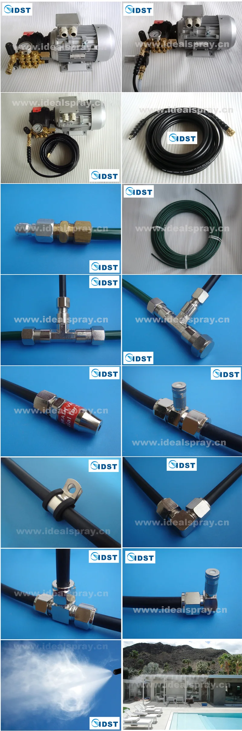 4 | Which system is the best choice for me? Low-Pressure Misting Systems The systems operate between 40 and 100 psi of water pressure. The variance in pressure is because they operate on your household water pressure and not a pump. Normally built with PVC or poly plastic tubing and are connected to a water hose. Typically found on outdoor patios and the misting will get you wet but cool if you are standing nearby. Mid-Pressure Misting Systems The systems operates between 100 and 250 psi of water pressure. A Mid-Pressure Pump is utilized to increase the pressure of the water flow. It is perfectly suited for backyard and patio misting. High Pressure Misting Systems The systems operate between 800 and 1200 psi (pounds per square inch) of water pressure. The systems will work very effectively in both low and high levels of humidity. Even when the humidity exceeds 90%, the effects of the system will be felt with the rapid drop in temperature and make you feel cool and more comfortable. High Pressure Systems create the most BTU's, because the systems produce smaller MIST and creating more cooling evaporation. As the micron water droplets flash evaporate they pick up heat from the air, which significantly drops the temperature between 25 and 35 degrees Fahrenheit, without making you wet. |