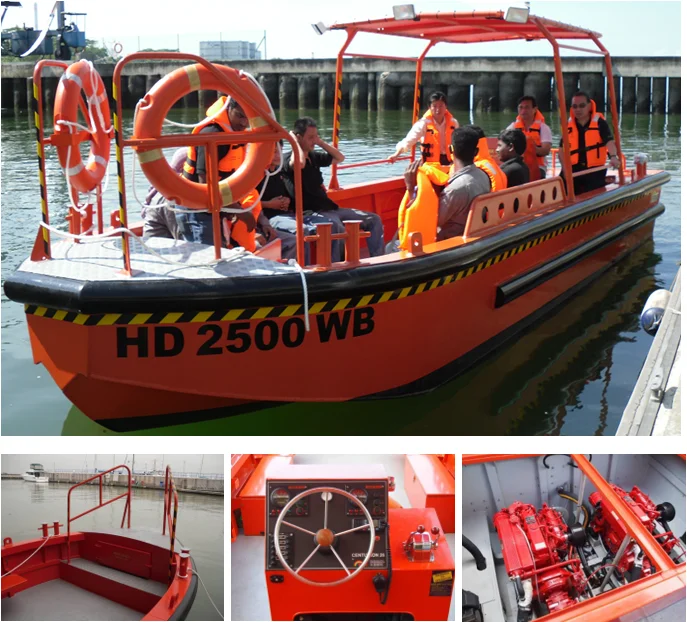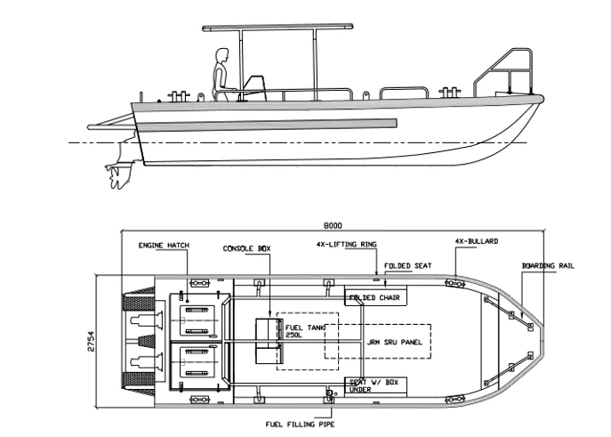 The Centurion 26 is a specially designed "tri-hull" design for unsurpassed stability for working at rest, dry riding in rough weather condition. The boat is designed to carry a total weight of 1500kg. With the large open cockpit, the boat can be outfitted with compressed air tanks, diving meters / panels, umbilical, making it a complete support boat!