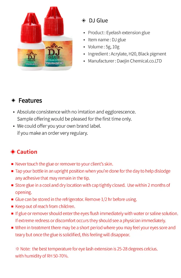 About US DaeJin Chemical is manufacturer of EYELASH EXTENSION Ultra bonding GLUE, PROTEIN REMOVER, GEL &LIQUID REMOVER, GLUE PRIMER and related cosmetics supplier in Korea.We trade innovative products to get comfortable lead in competitive market. -Honest spirit With an honest and devoted team, working with extraordinary enthusiasm and high efficiency,making every efforts to fulfil customer needs. Our Quality-Assurance carrying stress test on products play important role in whole process of producing a product. Daejin is dedicated to be a reliable business partner with innovated solutions to our global customers. - Environment focus We are very much aware towards nature and responsibility to keep it clean. We are very careful in selecting product which is least hazardous to environment. Pollution is a serious global problem and we all should actively participate to keep the environment clean.