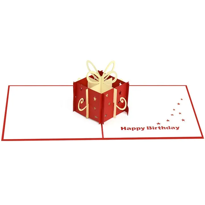 Open the cherry red card to reveal a detailed three - dimensional birthday present with a lovely bow on top. Each sides of this pop up present feature festive decorative laser-cut ribbon curls.