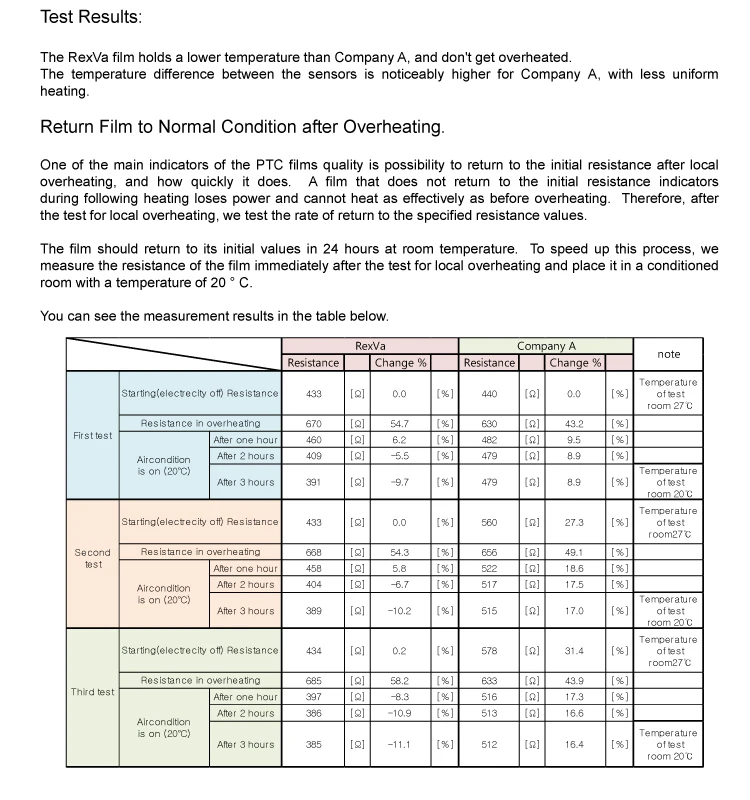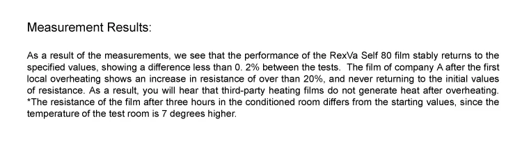 This is the reason Why heating film resistance does not change . Please refer to the life term test report in : //www.rexva.co.kr/home_en/qua03_01.php