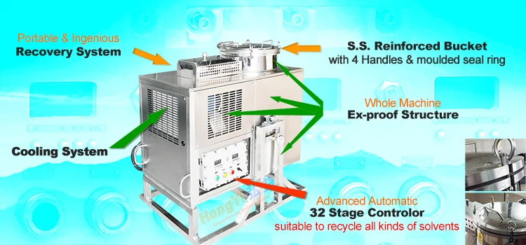 1. Only an electrical power supply is necessary. 2. Air-cooling system: No consumables requirements for the cooling system, no pollution to the environment, easy to move and small workspace requirements. 3. 32 stages control function: Each stage set a special heating temperature, each time period with a preset temperature, easy to recycle. 4. Automatic shutdown protection functions: After recycling solvent, automatically shut down. 5. Thermal oil heating system: explosion-proof, safer than the direct heating system. 6. Explosion-proof heater: Isolate heater from air and solvent. 7. Explosion-proof fan (for the air-cooling system only): safety. 8. Dumping structure design: easy to clean the residue. 9. All stainless steel case: easy to keep clean. 10. Thicken distillation bucket and cooling pipe.