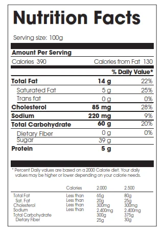 | Ingredients | Ingredients: Wheat flour, Eggs, Glucose syrup, Sugar, Shortening, Water, Dextrose, Humectants (sorbitol (420(i)), glycerol (422)), Sweetened condensed milk (3.9%), Vegetable oil, Starch, Emulsifiers (lecithin (322), mono and diglycerides of fatty acids (471)),Preservatives (potassium sorbate (202), sodium propionate (281)), Salt, Raising agent (sodium hydrogen carbonate (500(ii))), Artificial flavours ( Milk, Butter), , Acidity regulator ( citric acid (330)), Natural food colour ( Turmeric (100(ii))). |