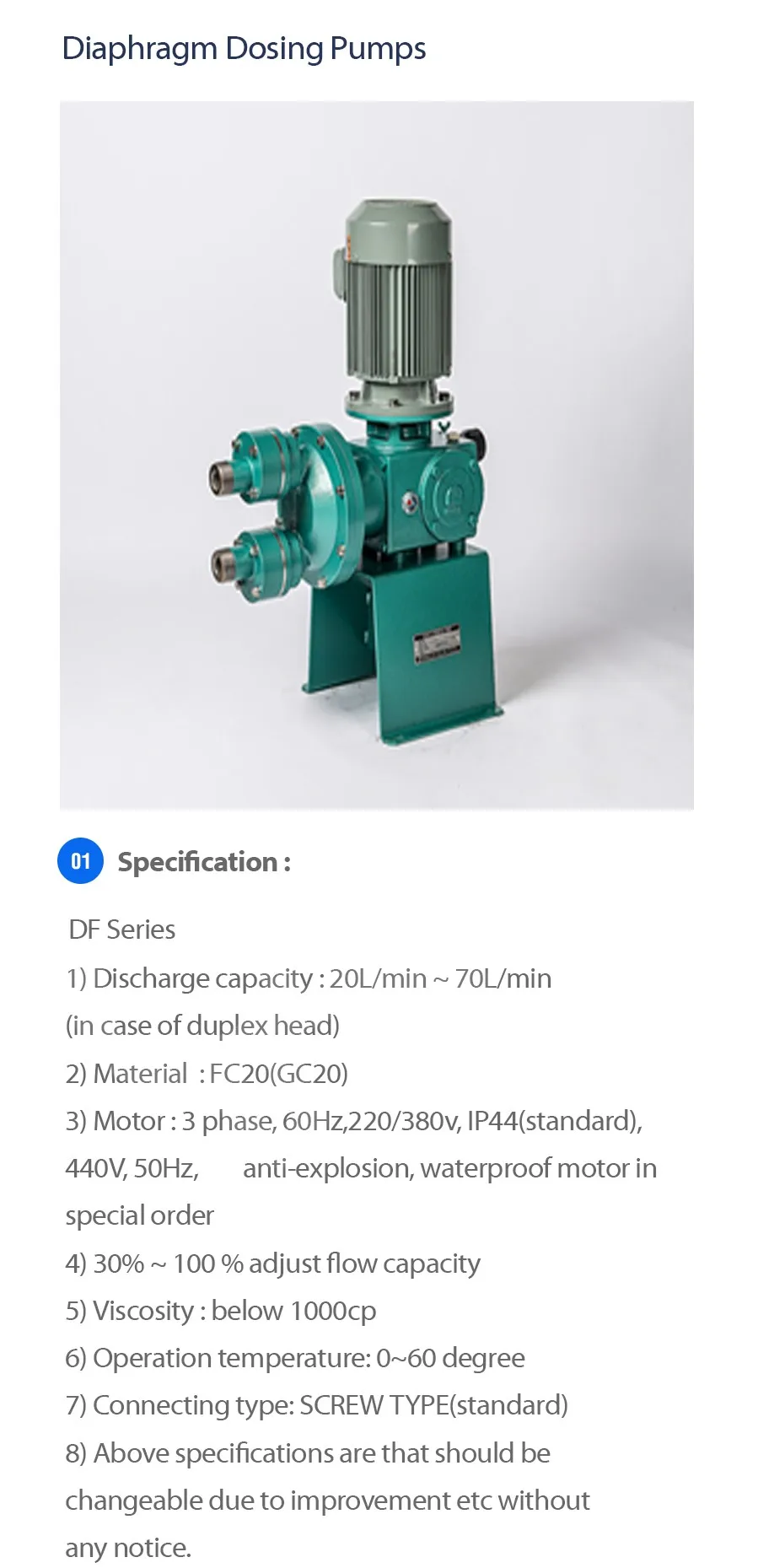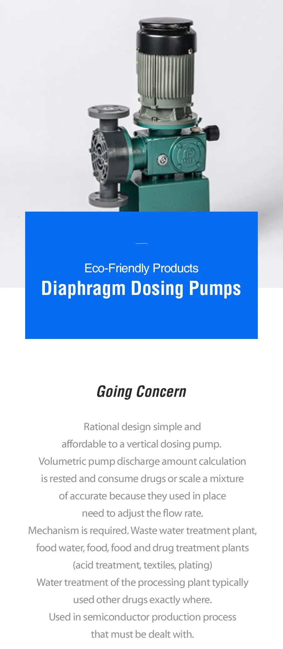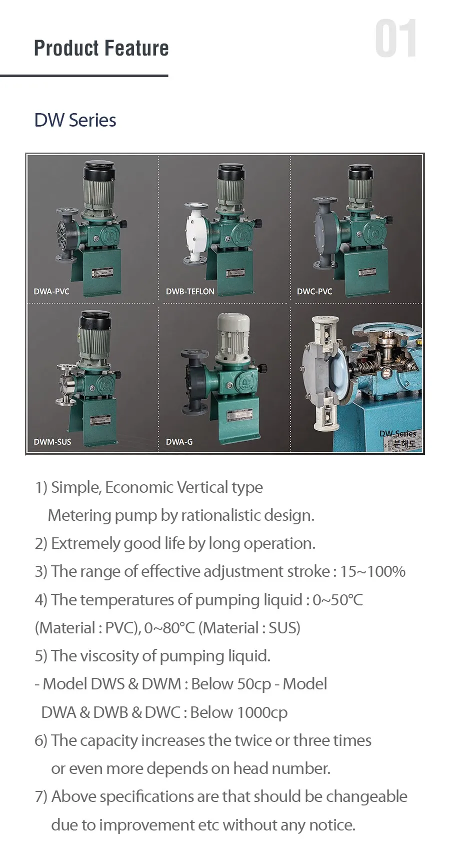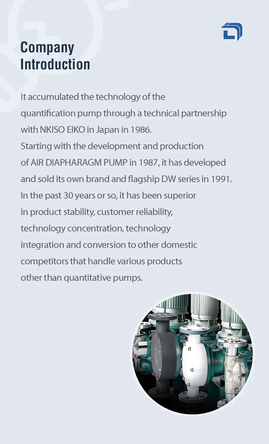 It accumulated the technology of the quantification pump through a technical partnership with NKISO EIKO in Japan in 1986. Starting with the development and production of AIR DIAPHARAGM PUMP in 1987, it has developed and sold its own brand and flagship DW series in 1991. In the past 30 years or so, it has been superior in product stability, customer reliability, technology concentration, technology integration and conversion to other domestic competitors that handle various products other than quantitative pumps.