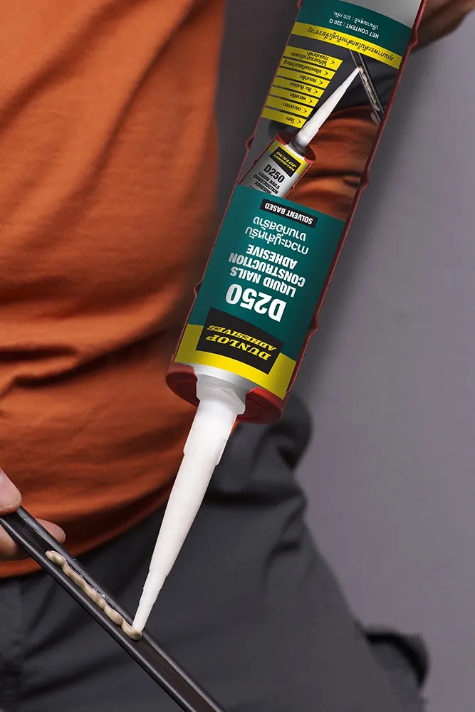 Dunlop Liquid Nail Construction Adhesive (D250) is a solvent based liquid nail adhesive, specially formulated to eliminate the need for nails and screws in construction. It is ideal for bonding substrates such as mirrors, marble worktops, border profiles, and metal. The unique formula means that it is faster and easier to gun, does not slump or run and is less stringy, eliminating mess at the end of a job and allowing easier clean up. It is a high strength adhesive with quick drying and low odour properties suitable for indoor and outdoor use.