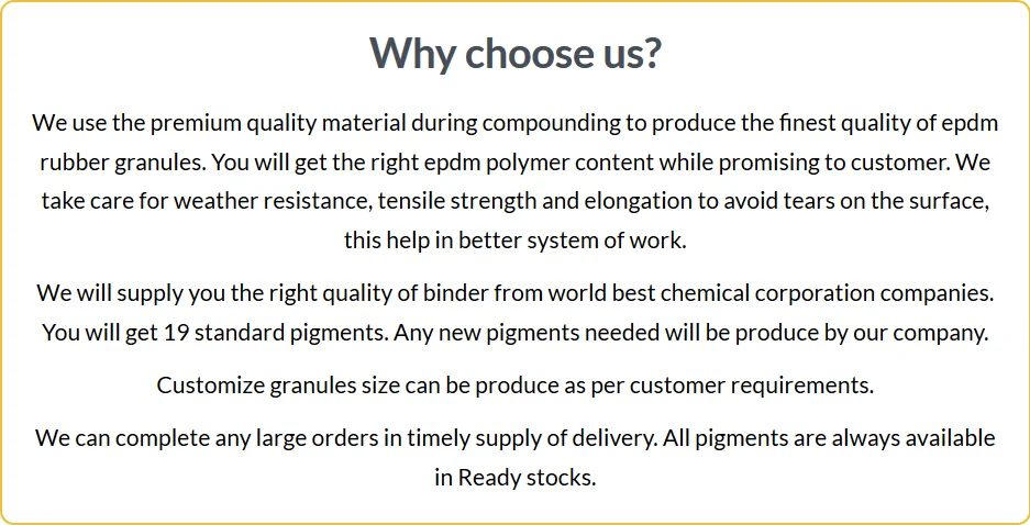 →The Cutting technology of epdm rubber granules is static. Buyer will not face any impurities like granules range uneven or powder content.