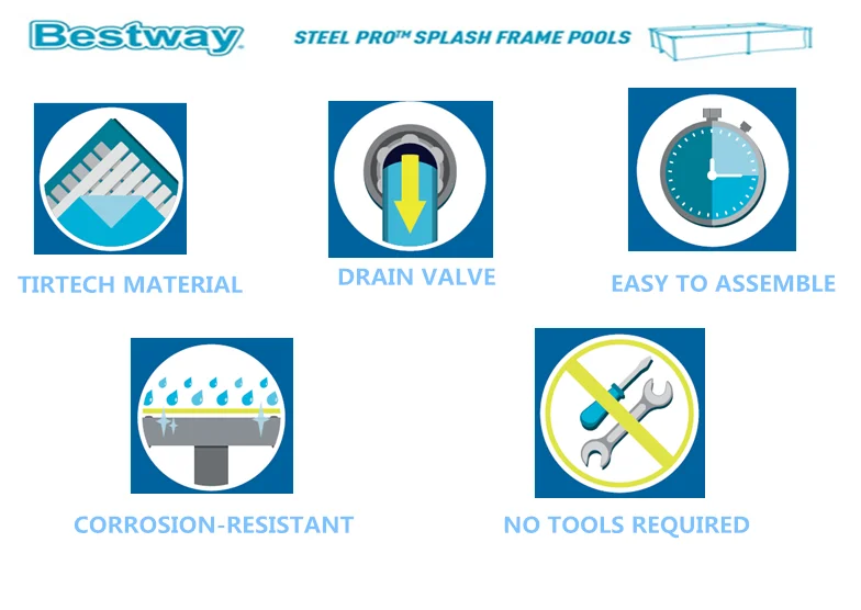 •The strength and security of rigid,super strong steel tube framing,plus simple,minimal-tool assembly make a Bestway power steel pool the smart choice for family.