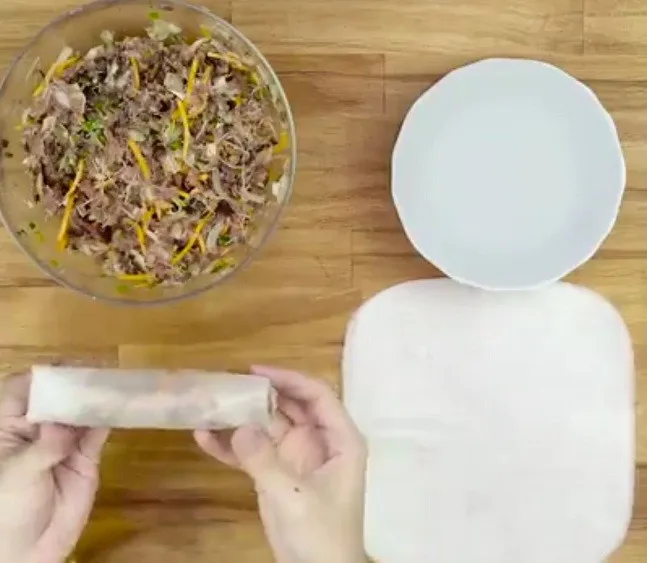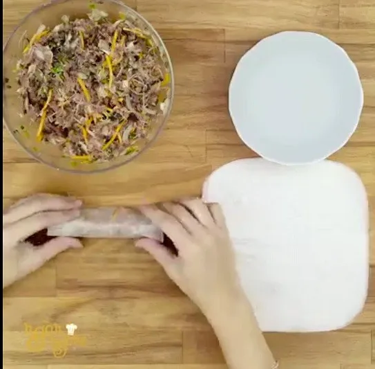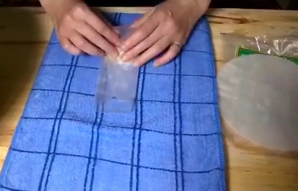 use the west towel on the table and plate the dried rice paper on to make it smoother and wrapping materials for fry
