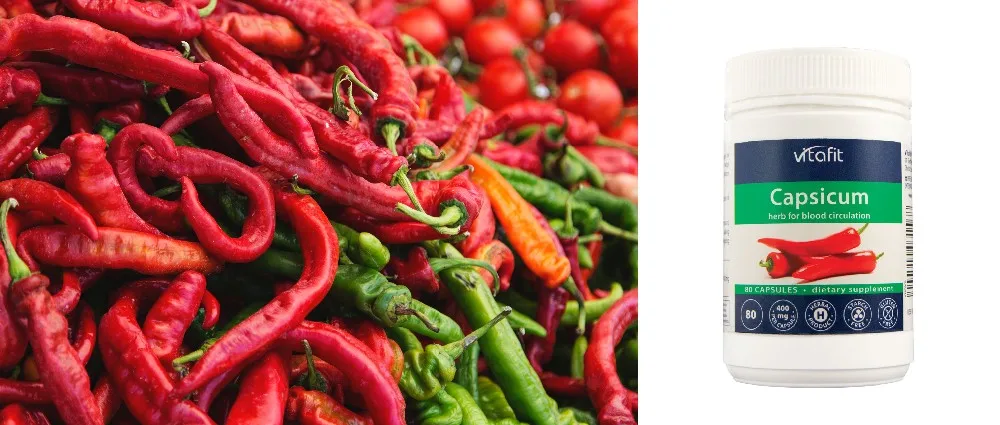 Capsicum (Capsicum annuum), also known as red pepper or chili pepper, is used widely in culinary and as herb. It helps maintain normal digestion, and support blood circulation including distributing nutrients around the body.