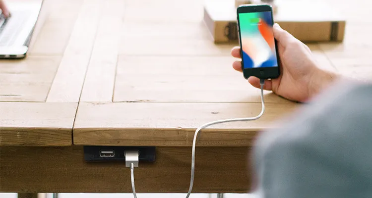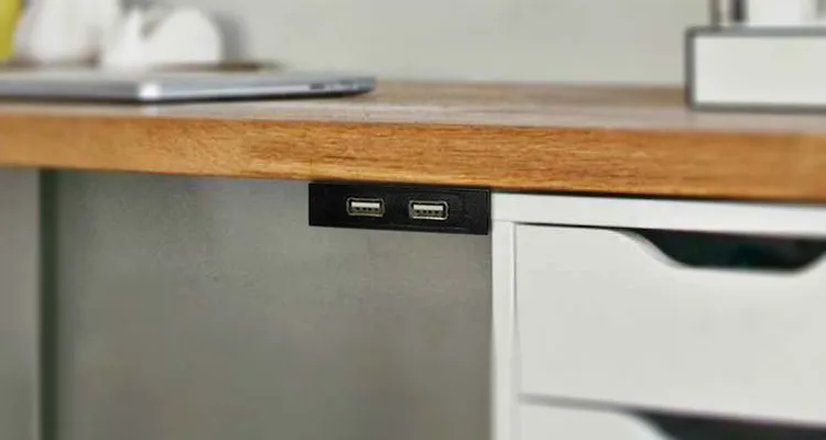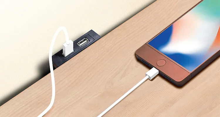 mounted underneath the front edge of the furniture, making charging easily accessible and keeping